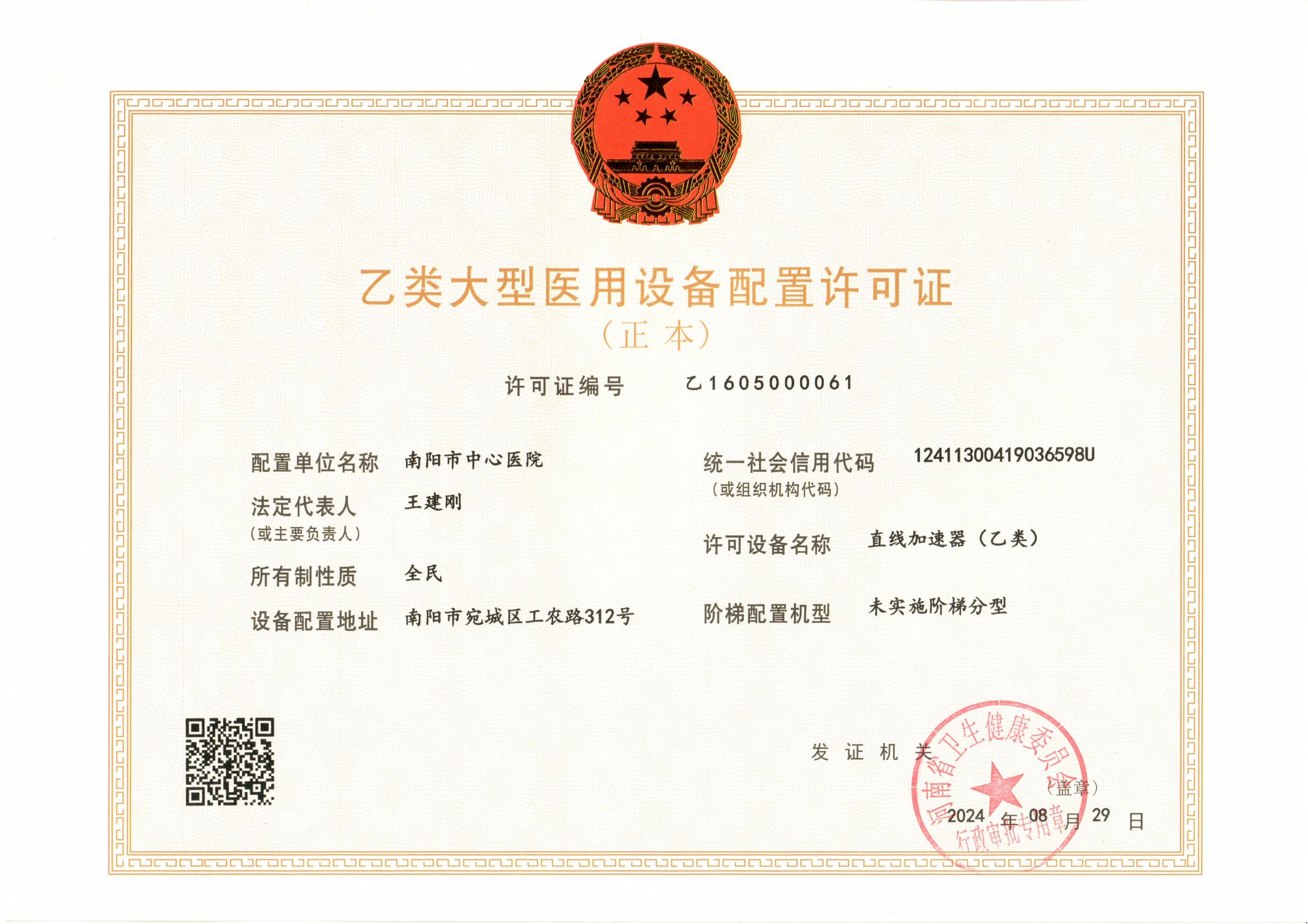 乙類大型醫(yī)用設(shè)備配置許可證(正本)直線加速器(乙類)(許可證編號(hào):乙1605000061)2024.08.29